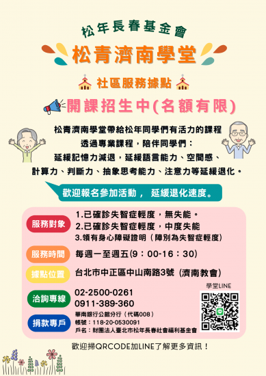 - 失智照護社區服務照護據點-安排『認知促進、緩和失智』和「共餐」等多元活動;透過照顧者支持性課程強化家庭照顧者照顧知能、社區照顧資源簡介、照顧壓力調適等。