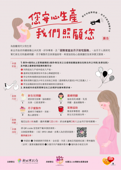相關附件:新北市弱勢家庭坐月子到宅服務申請表(請點我下載)