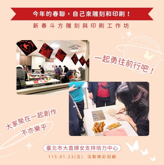 除夕將至,準備要除舊佈新,家裡的春聯是否都已換成最新的馬年版本了呢? 臺北市大直婦女支持培力中心已經準備好換上新春聯♦️了唷!我們趁著農曆過年前舉辦「今年的春聯,自己來雕刻和印刷」活動,邀請社區民眾,一起參與雕刻春聯的盛事。