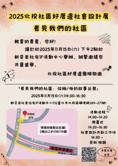 📍地點|新奇岩社宅活動中心 (北投區磺港路269~271號,近捷運奇岩站)
