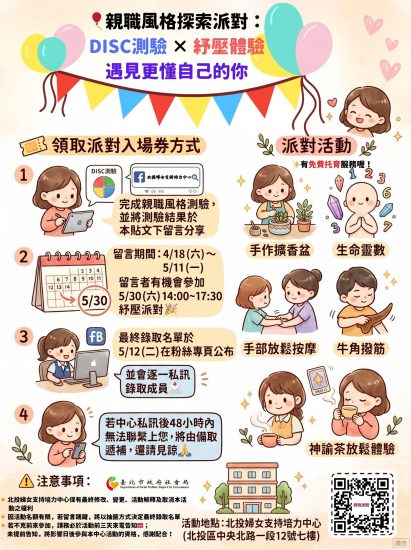 測測你的親職風格,抽療癒紓壓體驗 教養沒有標準答案,每個人都有自己的風格 來測測你的DISC親職風格,更了解自己,也多一點輕鬆與理解 完成測驗並臉書留言,還有機會抽療癒紓壓體驗! 一起放鬆一下,為教養補充滿滿能量 紓壓體驗內容包含: 手作擴香盆 生命靈數 手部放鬆按摩 牛角撥筋 神諭茶放鬆體驗 【如何參加抽選】 點擊心理測驗連結:https://peitou1918.github.io/ 完成測驗並將結果截圖 回到臉書活動貼文 https://pse.is/8y7l5f 留言 → 分享測驗結果截圖一句心得 親職風格探索派對:DISC測驗 × 紓壓體驗,遇見更懂自己的你 留言時間:4/18~5/11 名單公布:5/12 粉專公告+私訊通知 紓壓派對時間:5/30(六)14:00–17:30 注意事項: 若中心臉書私訊後48小時內無法聯繫上您,將由備取遞補 活動名額有限,留言踴躍將抽籤決定 未提前告知缺席,將影響日後活動報名資格 #北投活動 #北投婦女支持培力中心 #北投活動道相報 2026/04/22|臺北市北投婦女支持培力中心|0 條留言 歡迎轉貼分享 FacebookTwitterLinkedinRedditTumblrGoogle+PinterestVkEmail 相關文章: Permalink Permalink Permalink Permalink Permalink 留言 取消回覆 Comment