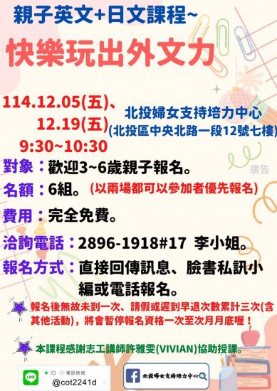 快來加入北投婦女支持培力中心的親子外文課!📚🎨