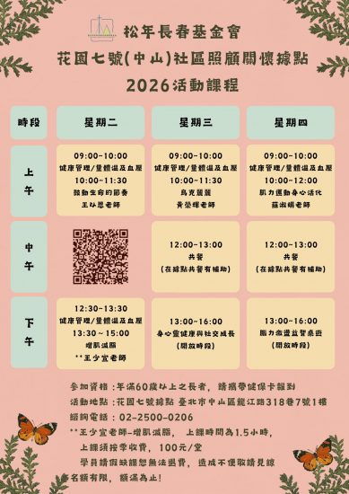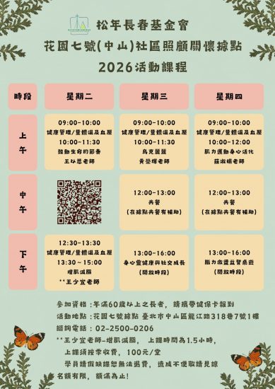 那就不要錯過松年長春基金會安排的2026花園七號關懷據點活動課程!