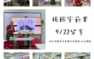 今年9月22日台北據點請楊國宇前輩做分享,請大家和據點一起關心,和我們一起愛台灣。