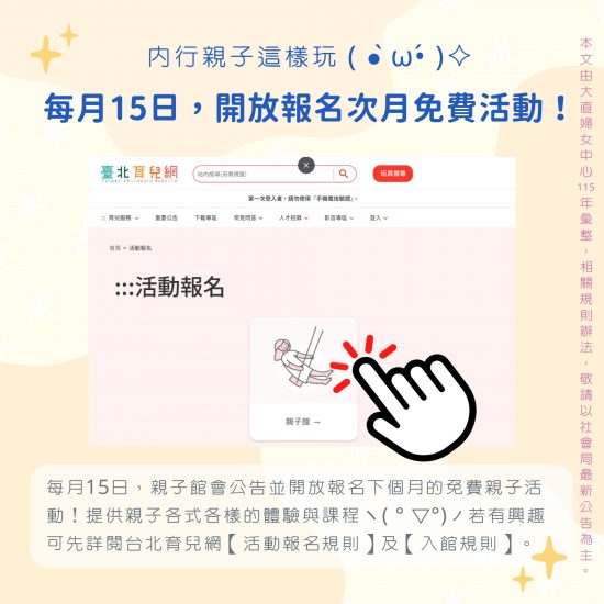 🎈內行玩法:每月15日,親子館會公告並開放報名下個月的免費親子活動!提供親子各式各樣的體驗與課程😆可先詳閱【台北育兒網】#活動報名規則 及 #入館規則。