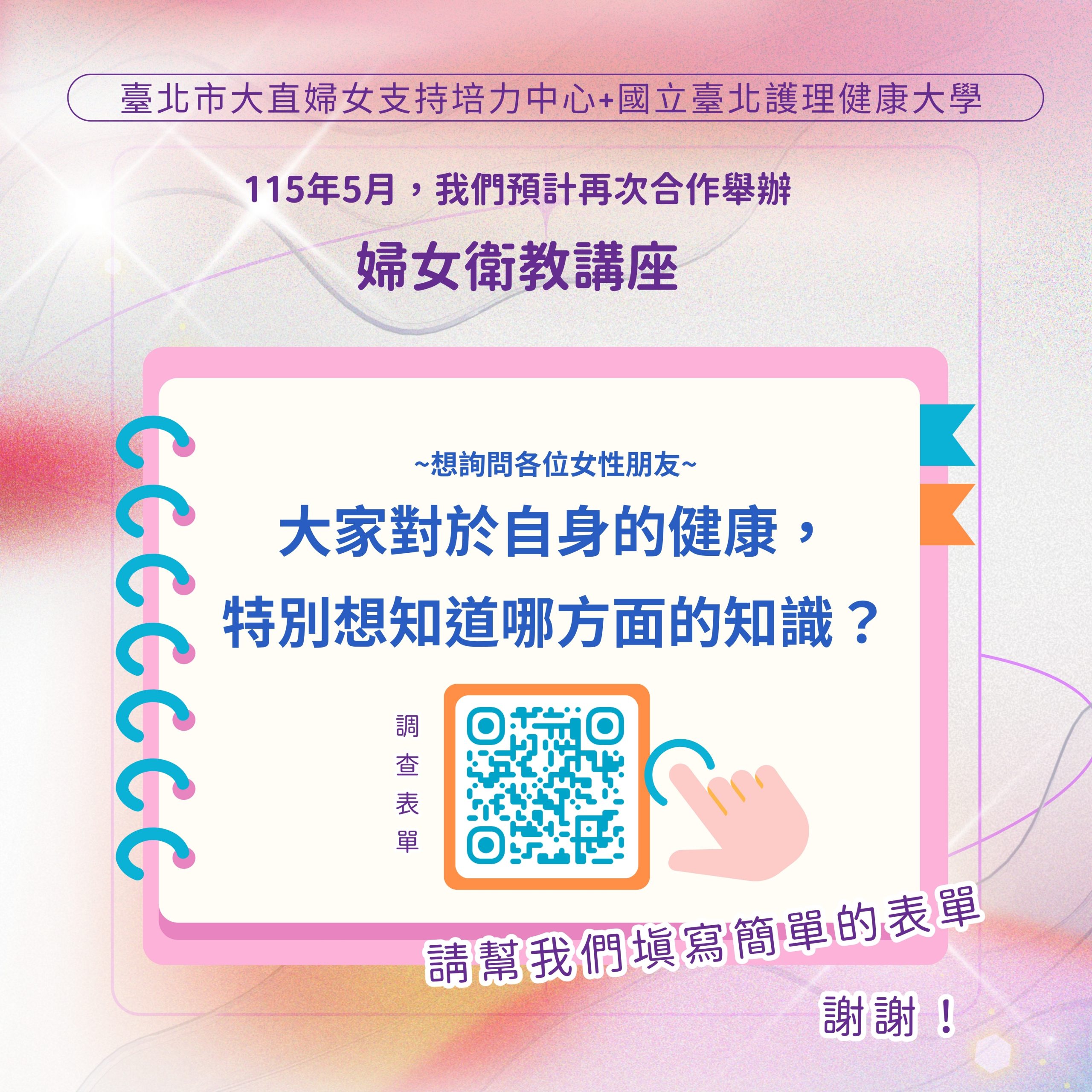 大直婦女中心的女性好友們──妳,擔心的課題是什麼呢?──對於自身的健康,特別想知道什麼方面的健康知識嗎?敬邀大家填答。