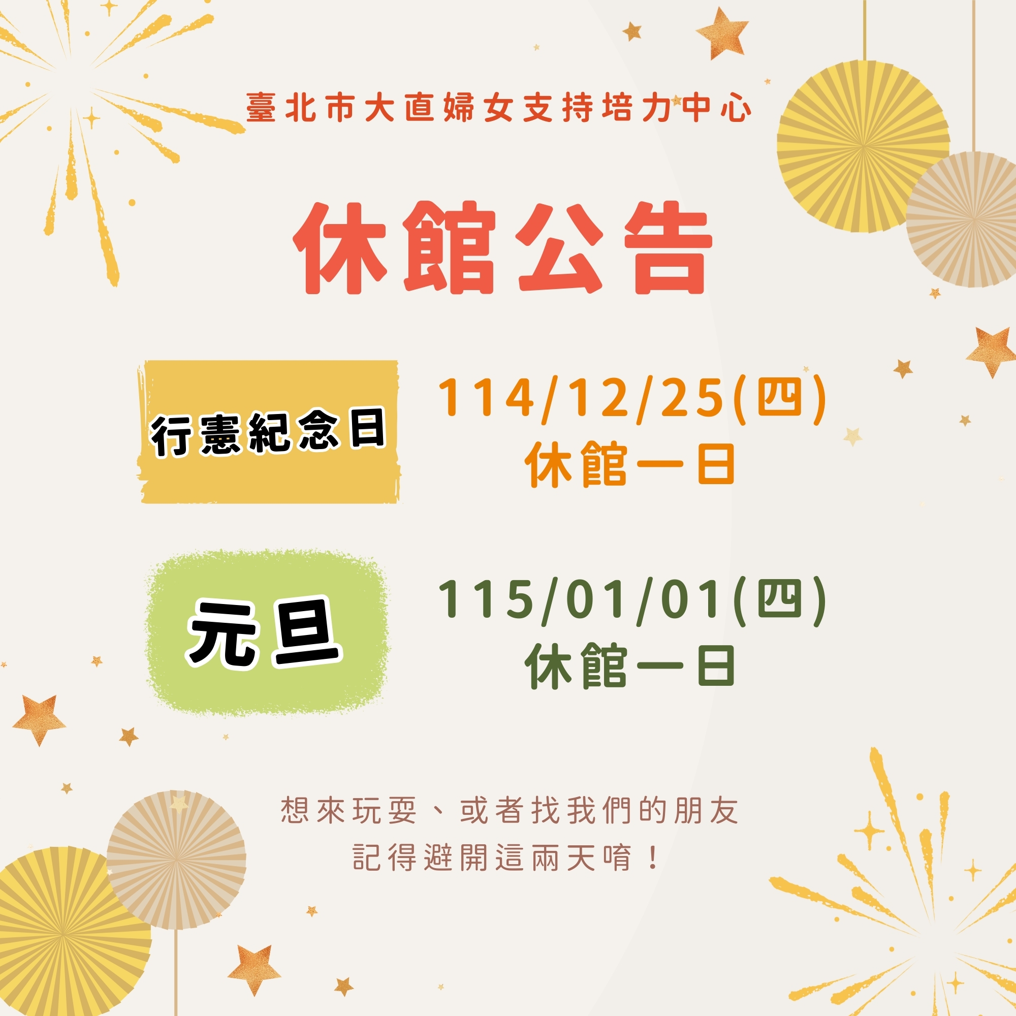 今年114/12/25、115/01/01(四)和大家一樣,都有休館一日唷!💓