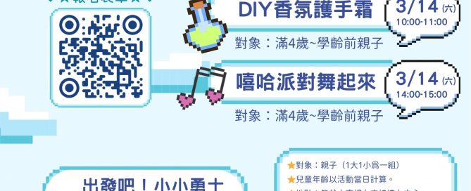 3/14與內湖親子館合作的兩場親子活動「DIY護手霜、嘻哈派對」,以及3/21中心舉辦的「幼兒體能遊戲」,一起來同樂吧!