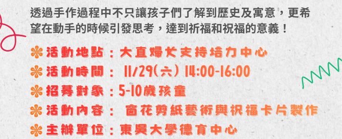 來自東吳大學的學生們,在這個充滿感恩與溫暖的月份,帶著孩子一起畫感恩卡片,製做「毛線手環」,希望能讓孩子好好感受到對自己與對他人的愛🫶