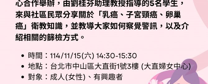 國立臺北護理健康大學護理系🏥, 與大直婦女中心合作舉辦, 敬邀大家一起來聽聽年輕講師們的課程活動吧!💕