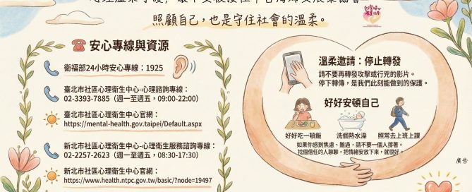 💛 昨晚的事件讓大家心裡都緊了一下💔 害怕、憤怒、不安、睡不著😔, 這不是脆弱,而是因為我們在乎彼此的安全。 🙏 溫柔提醒:請不要再轉發攻擊或行兇影片📹 那些畫面會一次又一次引發恐慌與不安😢 停下轉傳,就是此刻能做到的保護🛡️ 這段時間,比起一直刷新聞📱,更重要的是照顧自己🍲🛁 如果焦慮、心悸、難過😟,找信任的人聊聊🤝 [...]