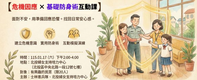 生活中偶爾會遇到突發狀況, 提前準備,就是對自己最溫柔的照顧 🤍 這堂課將分享實用的危機因應觀念, 並搭配簡單好上手的基礎防身技巧, 透過互動練習,讓身體記住保護自己的方式 💪 不需要害怕,也不必逞強, 只要多一點準備、多一份安心, 讓安全自然融入日常生活 [...]