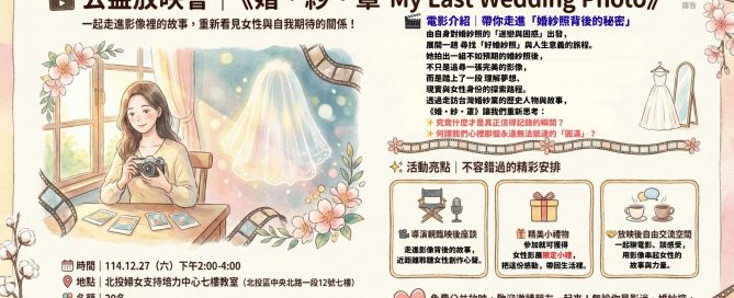🎬 女性影展公益放映會|《婚・紗・罩 My Last Wedding Photo》 一張婚紗照,承載的不只是幸福的想像, 還有每位女性對人生的提問與期待💭。 本次公益放映,邀你一起走進導演陳昱伶的影像世界, 透過溫柔又真誠的紀錄, [...]