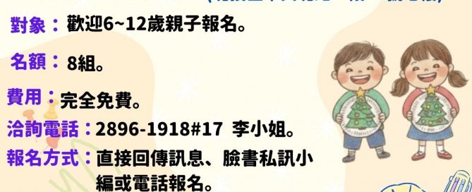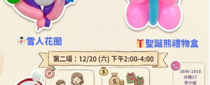 耶誕魔法來啦!🎄帶孩子一起動手做超萌聖誕小物🎨 🎉第一場:雪人花圈+聖誕熊禮物盒 🎉第二場:聖誕樹雪人+雪人棒棒糖 親子一起DIY, 不只創作可愛作品🏠, 還能邊玩互動小遊戲🤣 作品做完就能帶回家布置聖誕角落✨, 歡笑滿滿,節日氣氛滿點💖 快帶孩子來體驗最溫馨又有趣的聖誕手作時光吧!🎄☃️🎁 [...]