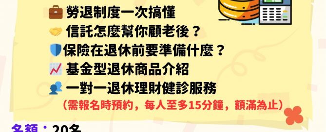 🌱有沒有想過,未來的自己會過著什麼樣的生活? 退休,不一定要等到某個年紀才開始想。 這場【退休理財講座】, 用生活中的例子, 陪你認識退休金怎麼來、保障怎麼準備, 還能一起試算看看自己的退休狀況🧮。 不需要理財背景, 只是一堂替未來多留一點安心的課☕ 歡迎帶著好奇心,來為未來的自己想一想🤍