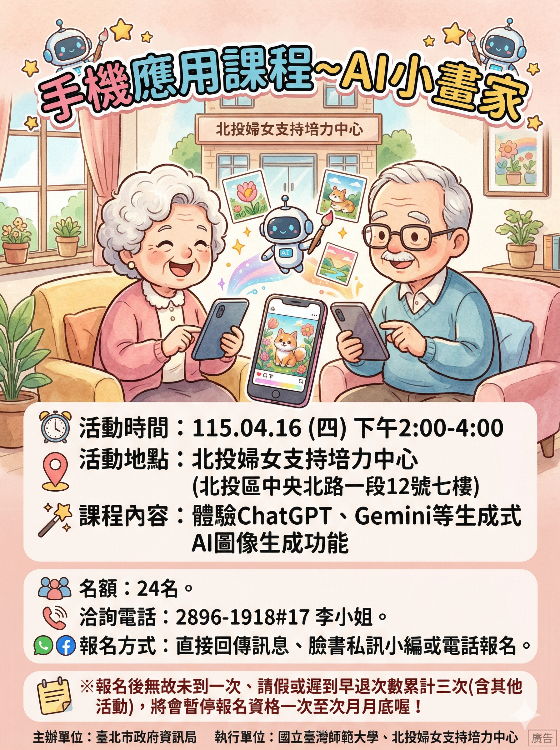 🎨手機也能變身AI小畫家!一起玩創意吧!✨ 你是否好奇,輸入幾個字就能生成一張專屬圖片? 這堂【手機應用課程~AI小畫家】帶你體驗超夯生成式AI!📱