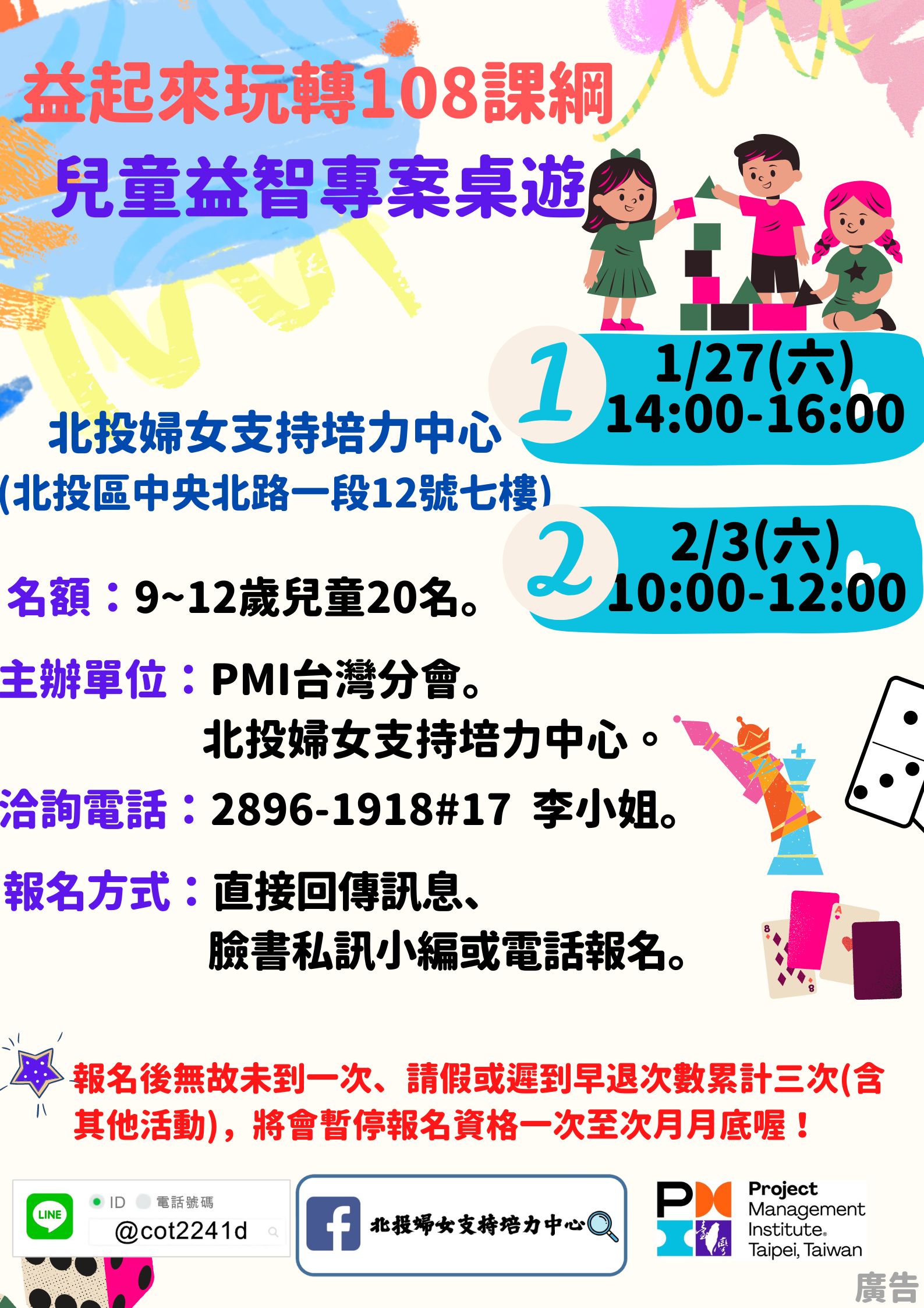 View Larger Image 益起來玩轉108課綱 兒童益智專案桌遊 #免費活動 你/妳有想過玩遊戲也可以訓練孩子的語言表達、 想像力以及邏輯組織能力嗎? 一起來透過不同故事背景的桌遊, 培養孩子邏輯思考、解決問題等多元能力, 以及學習該如何與同儕間良性競爭、互助合作吧!😊 #桌遊 #益智遊戲 #兒童活動 By admin|2024-01-18T17:43:13+08:002024-01-18|最新公告|0 條評論